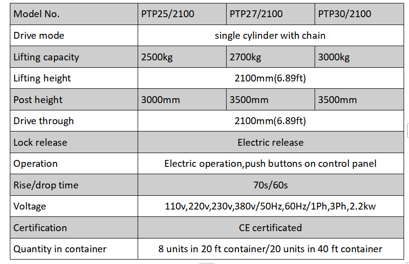 Untere Autos können beliebig geparkt oder abgeholt werden, wenn wir die oberen Autos parken oder abholen möchten, müssen wir zuerst die unteren Autos nehmen. Die maximale Hubhöhe des Geräts beträgt 2100mm, die maximale Tragfähigkeit 3000kg.