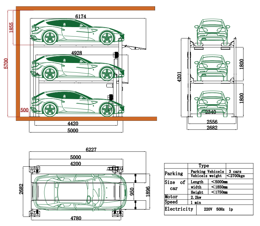 2. Elevador de almacenamiento de tres niveles (suelo + 2 niveles superiores) para estacionar 3 coches uno encima del otro.