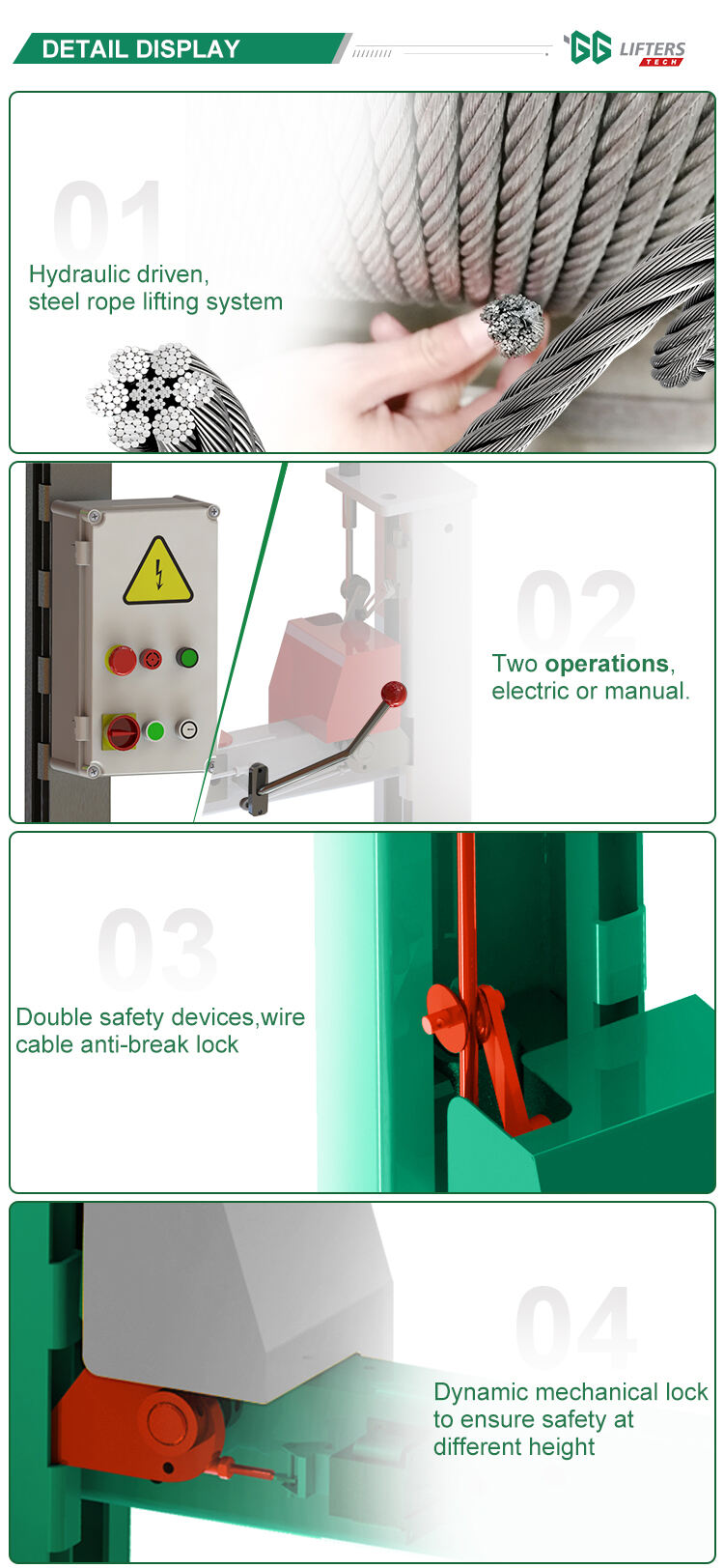 7. Cada columna tiene un electroimán y un bloqueo antirrotura del cable de acero, doble protección.